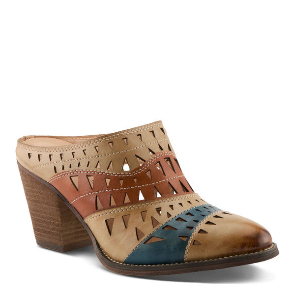 Unleash your wild side with the FANTASEE - a western-inspired mule that's anything but ordinary. This showstopping shoe features a laser-cut triangular design that dances across a color-blocked, hand-painted upper, delivering a fresh twist on a classic cowgirl silhouette.