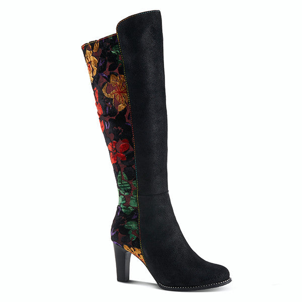 This mid-calf tall boot is a stunning piece with its unique velvet floral tapestry pattern on the back of the boot that exudes a touch of glamour. The rainbow stitching running down the boot adds a playful and colorful element, making it the perfect statement piece for any outfit. The perfect heel height ensures comfort and versatility, making this boot suitable for everyone.
